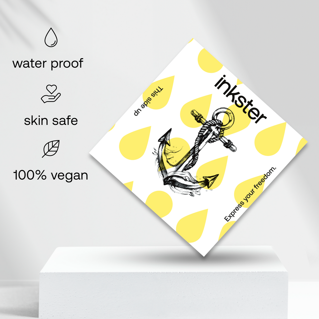 Unsere natürliche Inkster Tinte zieht in die erste Hautschicht ein und reagiert mit natürlichen Verbindungen in der Haut und der Luft, wodurch sie sich schwarz/blau färbt.