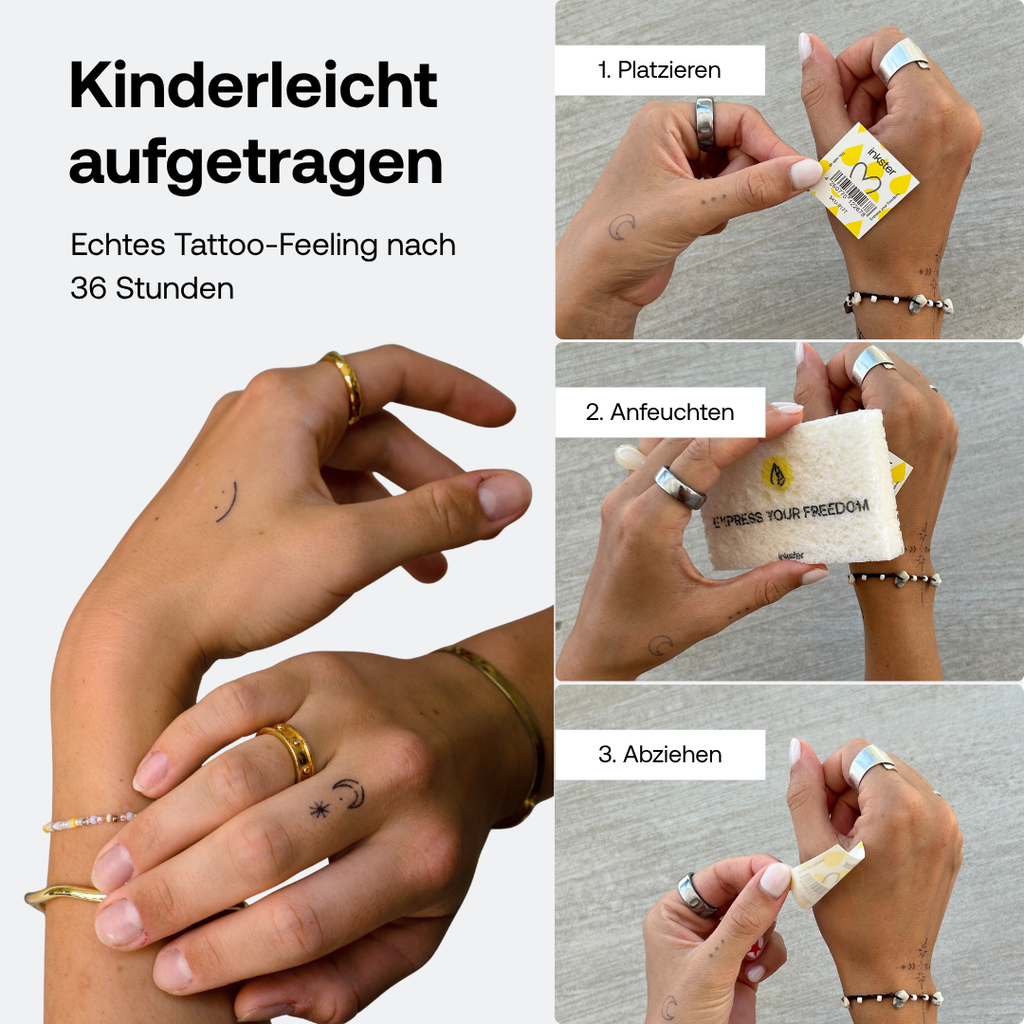 Für dein revolutionäres 2-Wochen-Tattoo von Inkster brauchst du nur das Tattoo, das du an deine Haustür geliefert bekommst. Eine Anleitung, wie man das Tattoo anbringt, befindet sich auf der Tattoo-Verpackung. Keine Sorge, es ist so einfach, nichts kann schief gehen!
