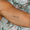 Carpe diem Tattoo - Das temporäre Tattoo für den Moment Bist du auf der Suche nach einem temporären Tattoo, das nicht nur stylisch ist, sondern auch eine tiefere Bedeutung hat? Dann ist das Carpe diem Tattoo von Inkster die perfekte Wahl für dich. Dieses Tattoo symbolisiert die wichtige Botschaft, den Moment zu ergreifen und das Leben in vollen Zügen zu genießen. Die Inspirationsquelle für das Carpe diem Tattoo liegt in der lateinischen Phrase "Carpe diem", die übersetzt "Nutze den Tag" bedeutet. Das Motiv erinnert uns daran, dass das Leben kurz ist und wir jeden Moment schätzen sollten. Es ist ein aufrufendes Tattoo, das uns daran erinnert, unsere Träume zu verfolgen und das Beste aus jedem Tag zu machen. Egal ob es eine kulturelle Bedeutung hat, historische Bezüge hat oder persönliche Geschichten symbolisiert, das Carpe diem Tattoo steht für eine tiefe und vielfältige Bedeutung. Du fragst dich, wo dieses inspirierende Tattoo am besten zur Geltung kommt? Das hängt ganz von deinem individuellen Stil und deinen Vorlieben ab. Das Carpe diem Tattoo eignet sich hervorragend für größere Flächen wie den Bauch oder den Rücken, um seine volle Wirkung zu entfalten. Es kann aber auch auf kleineren, feineren Stellen wie dem Nacken oder dem Fuß platziert werden, um eine subtilere Aussage zu machen. Das Carpe diem Tattoo ist ein vielseitiges Accessoire, das perfekt zu verschiedenen Outfits und Anlässen passt. Egal ob du zu einem sportlichen Event gehst, einen Shoppingbummel machst oder in den Urlaub fährst, dieses Tattoo wird deinen persönlichen Stil ergänzen und dich zum Blickfang machen. Kombiniere es mit einem lässigen Outfit für einen entspannten Look oder trage es zu einem eleganten Kleid, um deinem Style einen Hauch von Rebellion zu verleihen. Das Carpe diem Tattoo ist für alle Menschen geeignet, die den Moment leben und das Leben in vollen Zügen genießen möchten. Egal ob du ein junger Erwachsener bist, der sich gegen dauerhafte Tätowierungen entscheidet, oder jemand, der ein Tattoo testen möchte, dieses temporäre Tattoo ist die perfekte Wahl. Es eignet sich auch als Geschenk für Freunde oder als Symbol für bestimmte Interessengruppen oder Events, wie zum Beispiel für Sportbegeisterte oder Menschen, die gerne reisen. Also, worauf wartest du noch? Ergreife den Moment und bestelle das Carpe diem Tattoo von Inkster noch heute! Mit diesem temporären Tattoo hast du die Möglichkeit, deine Individualität und deinen Selbstausdruck zu zeigen, ohne dich langfristig zu binden. Lass dich von der symbolischen Bedeutung dieses Tattoos inspirieren und trage es mit Stolz. Denn das Leben ist zu kurz, um es nicht in vollen Zügen zu genießen!