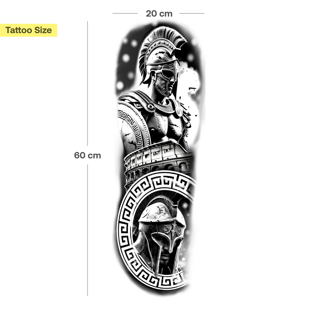 Der Krieger steht für Disziplin, Ehre und innere Stärke statt blinder Aggression. Schild und Helm symbolisieren den Schutz der eigenen Werte und Identität durch Taten, nicht Worte. Die antike Architektur repräsentiert Fundament, Vermächtnis und etwas aufzubauen, das Bestand hat.