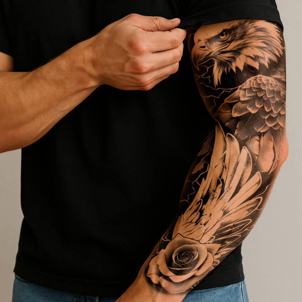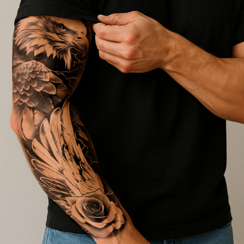 Unsere neuen Tattoo Sleeves sind nicht nur die größten und detailreichsten weltweit, sondern wurden gemeinsam mit einem echten Tattoo Artist entwickelt: Perfekt auf den Arm abgestimmt mit bedeutsamen Motiven– so, wie echte Tattoo Sleeves gestochen werden.