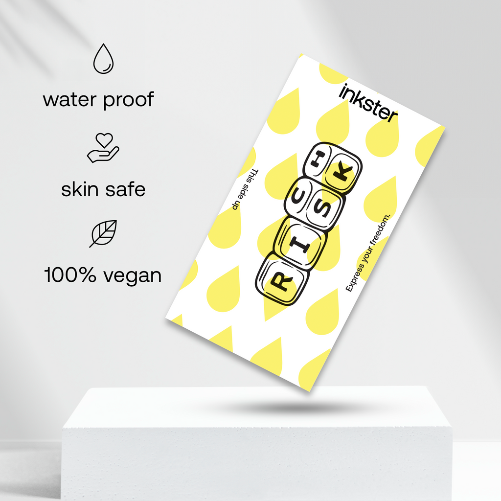 Für dein revolutionäres 2-Wochen-Tattoo von Inkster brauchst du nur das Tattoo, das du an deine Haustür geliefert bekommst. Eine Anleitung, wie man das Tattoo anbringt, befindet sich auf der Tattoo-Verpackung. Keine Sorge, es ist so einfach, nichts kann schief gehen!