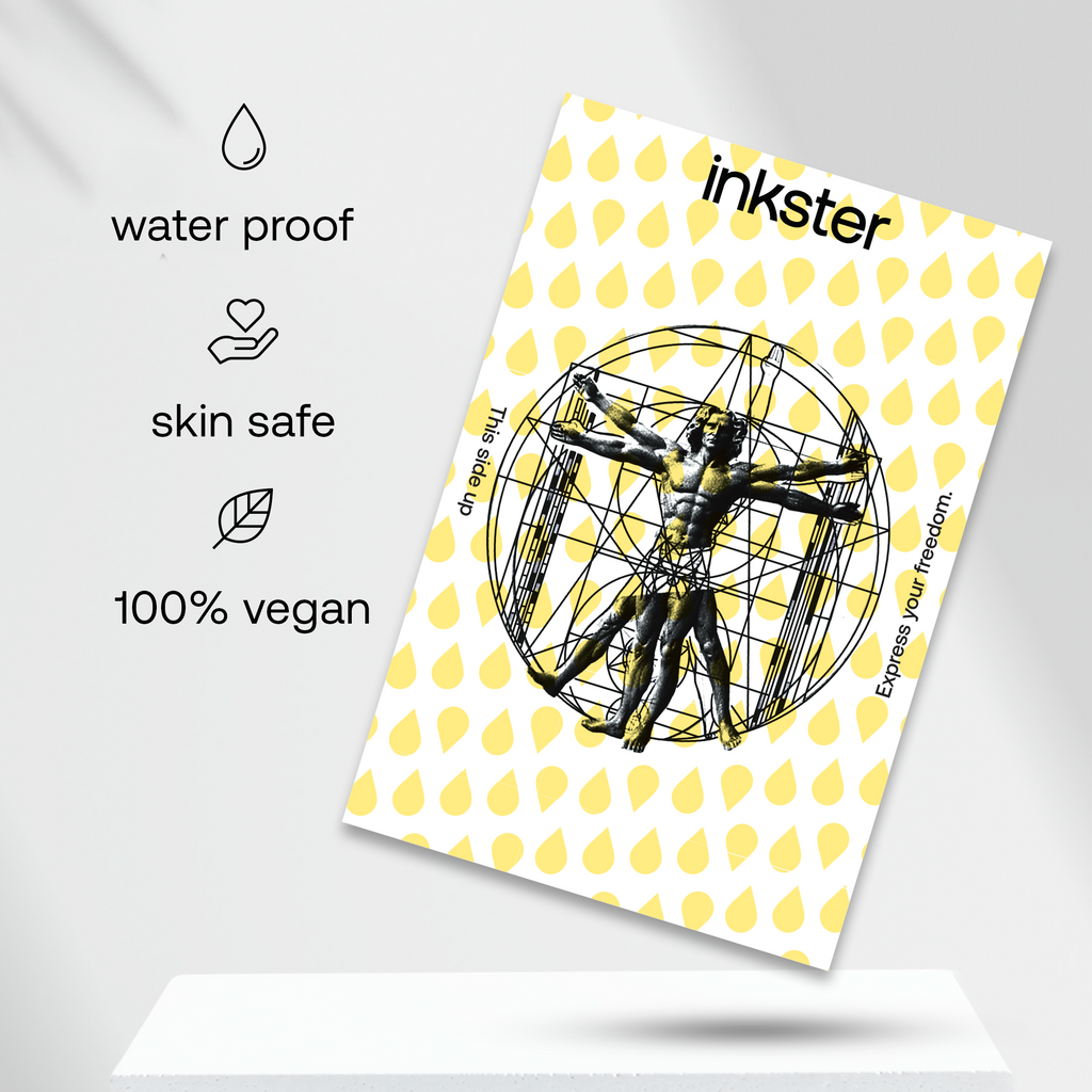 Für dein revolutionäres 2-Wochen-Tattoo von Inkster brauchst du nur das Tattoo, das du an deine Haustür geliefert bekommst. Eine Anleitung, wie man das Tattoo anbringt, befindet sich auf der Tattoo-Verpackung. Keine Sorge, es ist so einfach, nichts kann schief gehen!